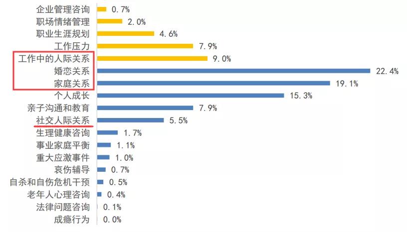 藍皮書的數據顯示,員工咨詢的議題中,與個人生活相關的議題為75.7%,與工作直接相關的議題為24.3%。仔細研究數據,我們發現,所有議題中有56%的議題都與人際關系有關,其中,婚戀關系(占 22.4%)和家庭關系(占 19.1%)更是成為員工最關注的兩大議題。