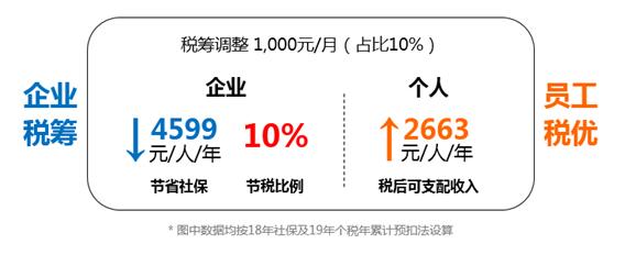 假設:上海市某企業一員工稅前工資為10,000元,年底雙薪,專項附加扣除為1600元/月。現每月將其稅前工資中的1,000元從工資調整到相應的福利科目。