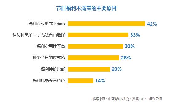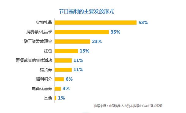 根據中智咨詢人力資本數據中心與中智關愛通聯合發布的《2018-2019企業福利管理實踐白皮書》,目前企業節日福利的發放形式以實物為主,企業占比為53%,其次為禮品卡,企業占比為35%。調研結果還顯示,員工對于節日福利不滿意的主要原因有:福利發放形式不滿意(42%),福利種類單一、無法自由選擇(33%),福利實用性不高(30%)等。