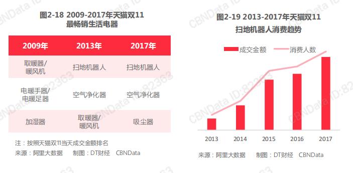 隨著科技的不斷創新,新興的家電爆品不斷涌現,智能小家電尤其值得關注。從天貓雙11當天成交金額來看,2009年的家庭“三小件”是取暖器/暖風機、電暖手器/電暖足器和加濕器,2017年的新家庭“三小件”更新為掃地機器人、空氣凈化器和吸塵器,在天貓雙11當天購入掃地機器人的消費者數量相對五年前上漲了4倍。