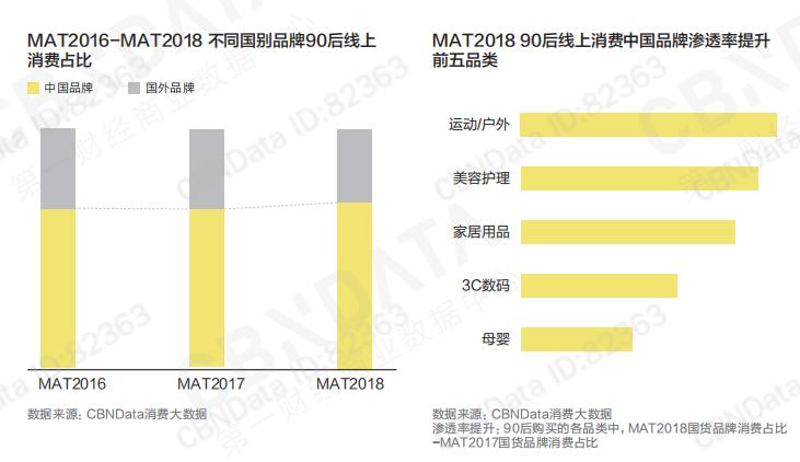 近年來,原創服裝、家居和文創的崛起,說明了在新消費時代,越來越多的人愿意為更好的設計買單,有意識地追求更符合自我偏好的商品,消費需求更加多元化。這一點,在90后身上尤為明顯。他們青睞國貨,相比品牌,更關注產品本身,拒絕隨波逐流,喜歡能彰顯自我個性的物品。根據2018年的大數據報告,90后線上消費中,中國品牌的消費規模占比逐年提升。其中,90后購買的運動/戶外相關品類中,中國品牌的占比提升最快。